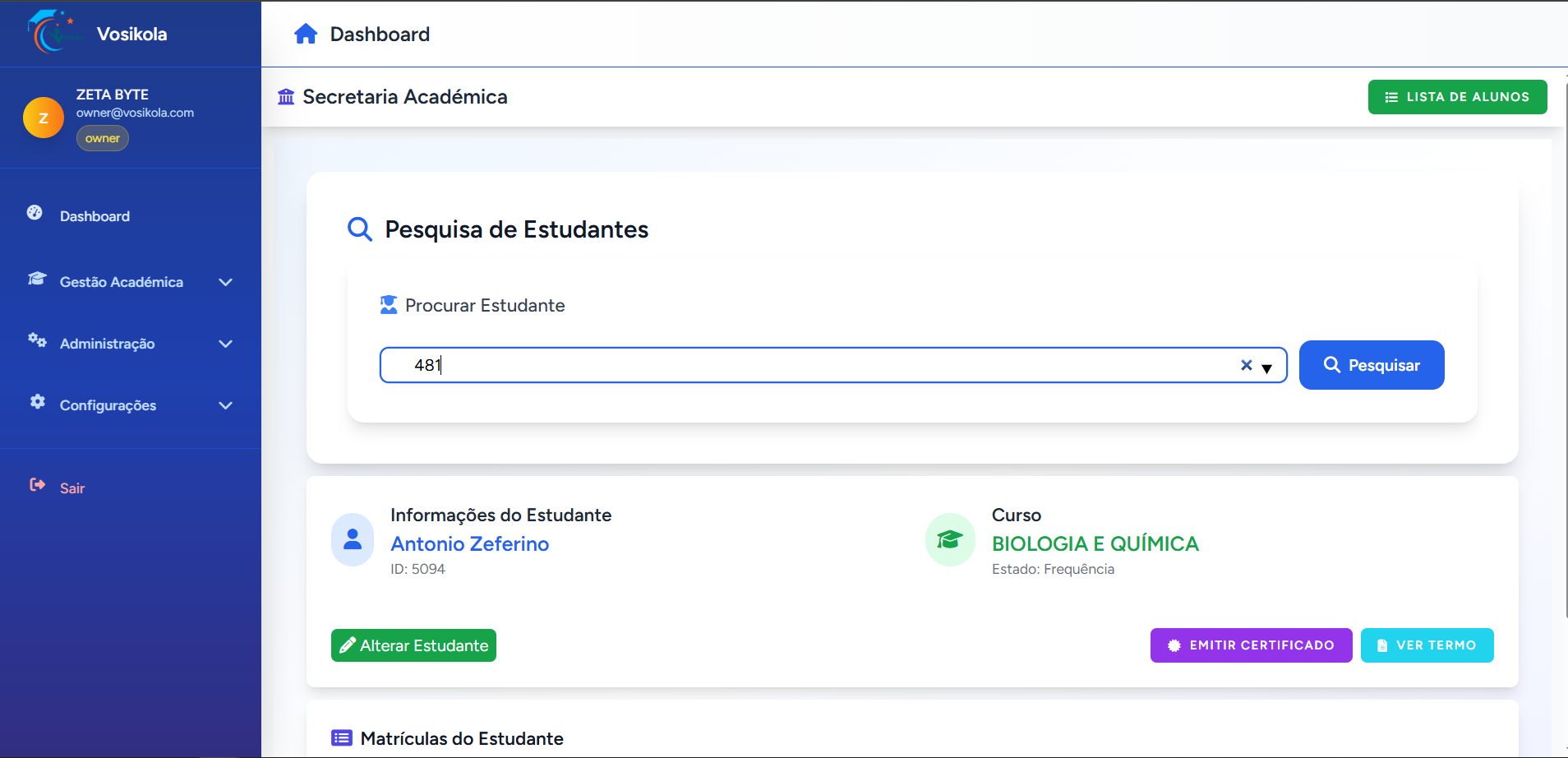 Processamento rápido de matrículas, gestão de desistências, consulta de dados e notas dos estudantes