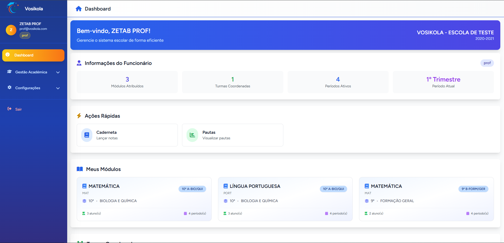 Gestão completa das turmas e disciplinas, lançamento de notas, relatórios detalhados e rankings de desempenho